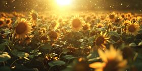 Vibrant sunflower field background, a sea of bright yellow sunflowers stretching across the landscape, their faces turned toward the sun under a clear blue sky, creating a warm and cheerful atmosphere.