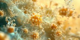 Virus microscopic organism background, a close-up view of a viral particle, with intricate details of its structure, surrounded by a dark, textured background to emphasize its microscopic size and complexity.