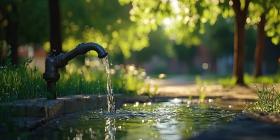 Water Tap Running in Park Background, Flowing Water from Tap Surrounded by Lush Greenery and Nature