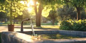 Water Tap Running in Park Background, Flowing Water from Tap Surrounded by Lush Greenery and Nature