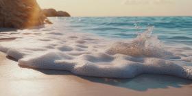 White waves lapping on a sandy beach background, gentle surf rolling onto the soft golden sand, creating a serene and tranquil coastal scene under a clear sky.