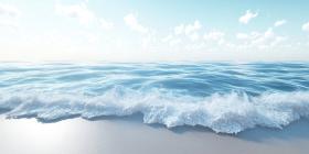 White waves lapping on a sandy beach background, gentle surf rolling onto the soft golden sand, creating a serene and tranquil coastal scene under a clear sky.