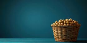 Wicker basket overflowing with peanuts with copyspace background, a rustic basket filled with plump, shelled peanuts, set against a simple backdrop that leaves ample room for text or branding.