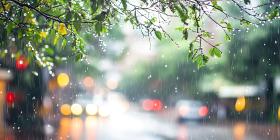 Winter rainy monsoon season with green trees, raindrops on branches, and a blurred street background, a peaceful scene with rain gently falling on lush green foliage, with blurred city streets in the distance, evoking a calm, rainy atmosphere.