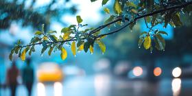 Winter rainy monsoon season with green trees, raindrops on branches, and a blurred street background, a peaceful scene with rain gently falling on lush green foliage, with blurred city streets in the distance, evoking a calm, rainy atmosphere.