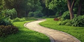 Winding pathway in a park bordered by lush green grass garden background, a gentle trail meandering through vibrant greenery, with well-kept grass and trees lining the way, creating a peaceful and inviting atmosphere for a leisurely walk.