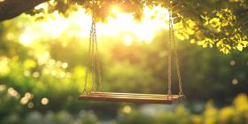Wooden Swing Hangs from Tree Branch on Sunny Day Background, Peaceful Scene with a Swing Gently Hanging from a Tree, Bathed in Warm Sunshine
