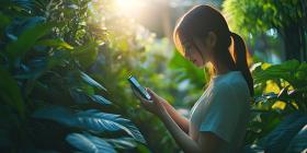 Young woman using her phone in a lush green garden, checking her examination results or updates, surrounded by vibrant plants and flowers, with a peaceful and focused atmosphere.