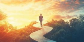 Journey Through Serene Nature: A Person Walking Along a Winding Path Amidst Lush Greenery with a Vibrant Sunrise or Sunset