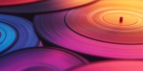 Vibrant Collection of Colorful Vinyl Records: Overlapping Pink, Blue, Orange, and Yellow Records with Grooves and Circular Pattern