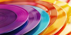 Vibrant Collection of Colorful Vinyl Records: Overlapping Pink, Blue, Orange, and Yellow Records with Grooves and Circular Pattern