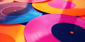 Vibrant Collection of Colorful Vinyl Records: Overlapping Pink, Blue, Orange, and Yellow Records with Grooves and Circular Pattern