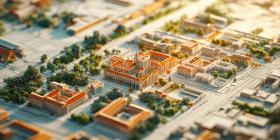 Miniature Urban Model: Detailed Scale Representation of a City or University Campus with Prominent Historical Building, Roads