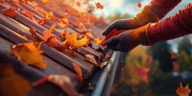 Autumn Gutter Cleaning: Close-Up of Person in Red Jacket Removing Fallen Leaves from Roof Gutter with Gloved Hands and Tool Amidst Golden Light of Fall Season