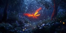 Enchanting Forest Glow: Illuminated Butterfly Hovering Over a Stream Surrounded by Lush Vegetation in a Dimly Lit Woodland
