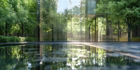 Modern Architectural Structure in a Lush Green Forest: A Seamless Blend of Glass Walls Reflecting Nature, with Polished Stone Floors and a Reflective Water Surface