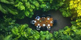 Eco-Friendly Outdoor Meeting: Overhead View of Professionals Engaged in a Sustainable Meeting Amidst Lush Greenery