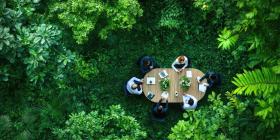 Eco-Friendly Outdoor Meeting: Overhead View of Professionals Engaged in a Sustainable Meeting Amidst Lush Greenery