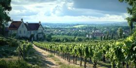 Rows of Grape Vines Stretching into the Distance with Lush Green Hills and Rocky Cliffs Under a Partly Cloudy Sky Bathed in Golden Sunlight