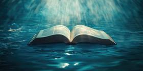 Open Book Suspended on the Tranquil Surface of Blue-Green Water with Gentle Ripples, Symbolizing the Harmony Between Learning and Nature