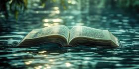 Open Book Suspended on the Tranquil Surface of Blue-Green Water with Gentle Ripples, Symbolizing the Harmony Between Learning and Nature