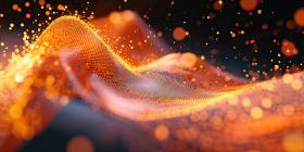 Dynamic Wave of Glowing Orange Dots: Abstract Digital Art with Fluid Motion and Bokeh Light Effects Against a Dark Background