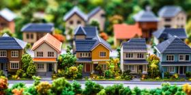 Charming Suburban Neighborhood Model: Detailed Miniature Scene Featuring Vibrant Houses, Distinct Architectural Features