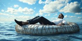 Serene Sunset on a Calm Lake: Person Relaxing on an Inflatable Raft, Reflecting Warm Colors of the Evening Sky