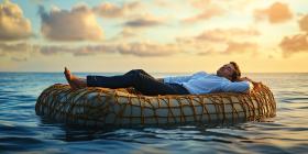 Serene Sunset on a Calm Lake: Person Relaxing on an Inflatable Raft, Reflecting Warm Colors of the Evening Sky