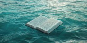 Open Book Suspended on the Tranquil Surface of Blue-Green Water with Gentle Ripples, Symbolizing the Harmony Between Learning and Nature
