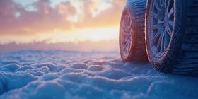 Winter Sunrise: Frosty Car Tires on Snowy Ground with Warm Sunrise in the Background