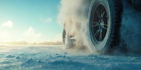 Winter Sunrise: Frosty Car Tires on Snowy Ground with Warm Sunrise in the Background