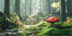 Tranquil Forest Scene: Sunlight Filtering Through Canopy onto Moss-Covered Forest Floor and Tree Base