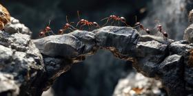 Ants Traversing a Natural Rock Bridge: Close-Up of Cooperative Ants Moving Across a Narrow, Uneven Rocky Pathway in a Blurred Background