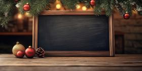 Christmas Blackboard: Wooden-Framed Blackboard on a Wooden Surface, Surrounded by Holiday Decor Including a Christmas Tree with Lights and Ornaments