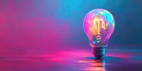 Vibrant Light Bulb with Colorful Smoke: Clear Light Bulb Surrounded by Blue, Pink, and Orange Smoke Against a Gradient Blue and Purple Background