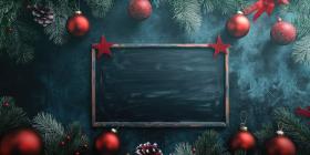 Christmas Blackboard: Wooden-Framed Blackboard on a Wooden Surface, Surrounded by Holiday Decor Including a Christmas Tree with Lights and Ornaments