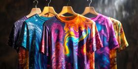 Vibrant Array of Colorful T-Shirts: Abstract Patterns and Designs Displayed on Wooden Hangers in a Boutique Setting