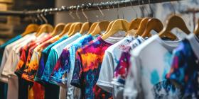 Vibrant Array of Colorful T-Shirts: Abstract Patterns and Designs Displayed on Wooden Hangers in a Boutique Setting
