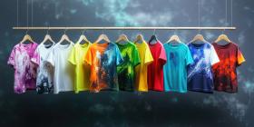 Vibrant Array of Colorful T-Shirts: Abstract Patterns and Designs Displayed on Wooden Hangers in a Boutique Setting