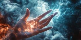 Ethereal Cosmic Hand: Mystical Glowing Hand with Luminous Particles and Starry Sky, Blending Human Anatomy with Otherworldly Elements