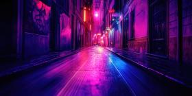 Vibrant Neon Nightscape: Urban Street Illuminated by Pink, Purple, and Blue Lights Reflecting on Wet Pavement, Creating a Cyberpunk Aesthetic