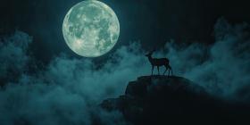 Majestic Deer Silhouette in Moonlight: Mystical Scene with a Deer on a Rocky Outcrop, Illuminated by a Bright Full Moon and Surrounded by Mist