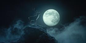 Majestic Deer Silhouette in Moonlight: Mystical Scene with a Deer on a Rocky Outcrop, Illuminated by a Bright Full Moon and Surrounded by Mist
