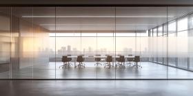Modern Conference Room with Cityscape View: Professional Meeting Space Featuring a Long Table, Sleek Chairs, and Floor-to-Ceiling Windows Overlooking an Urban Skyline