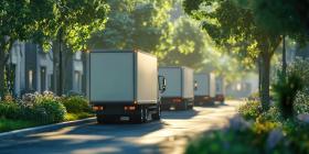 Row of Delivery Trucks in Urban Setting: Modern Vehicles Parked on a Wet Street Reflecting Their Vibrant Color, Against a Backdrop of a Contemporary Building