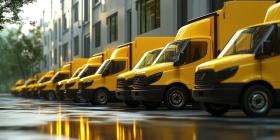 Row of Delivery Trucks in Urban Setting: Modern Vehicles Parked on a Wet Street Reflecting Their Vibrant Color, Against a Backdrop of a Contemporary Building