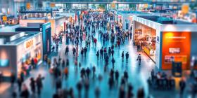 Bustling Trade Show: Crowded Exhibition Hall with Multiple Booths, Engaging Displays, and Numerous Attendees Exploring Business and Technology Offerings