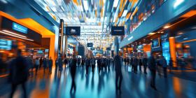 Bustling Trade Show: Crowded Exhibition Hall with Multiple Booths, Engaging Displays, and Numerous Attendees Exploring Business and Technology Offerings