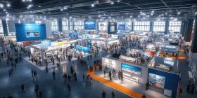 Bustling Trade Show: Crowded Exhibition Hall with Multiple Booths, Engaging Displays, and Numerous Attendees Exploring Business and Technology Offerings